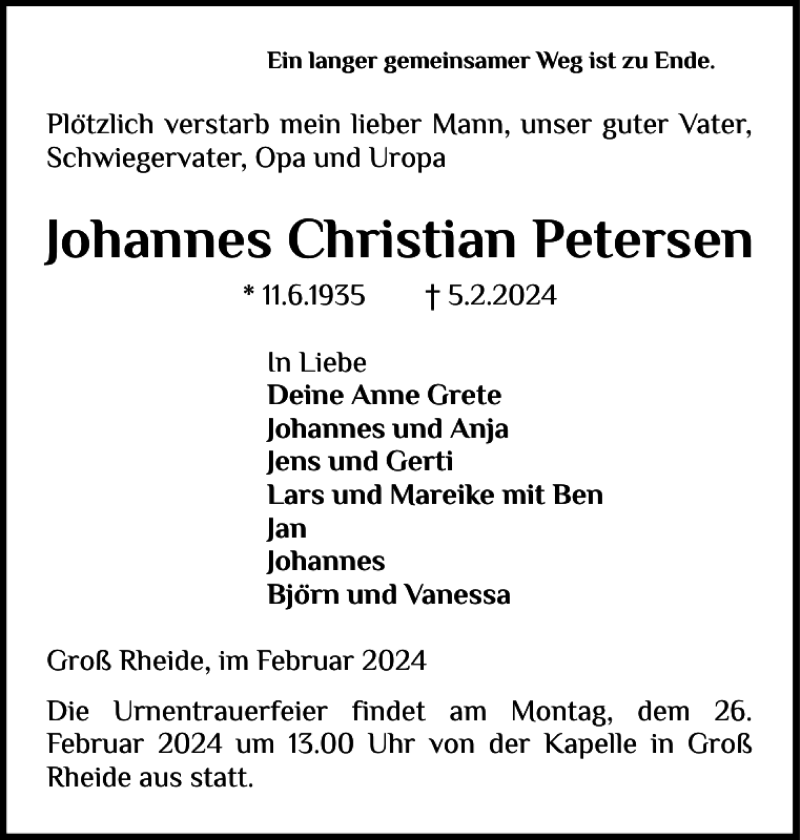 Hier finden Sie alle Traueranzeigen aus der Zeitung, die bisher für Johannes Christian Petersen erschienen sind. Weitere Traueranzeigen, die in der Zeitung erscheinen, werden hier ebenfalls aufgelistet