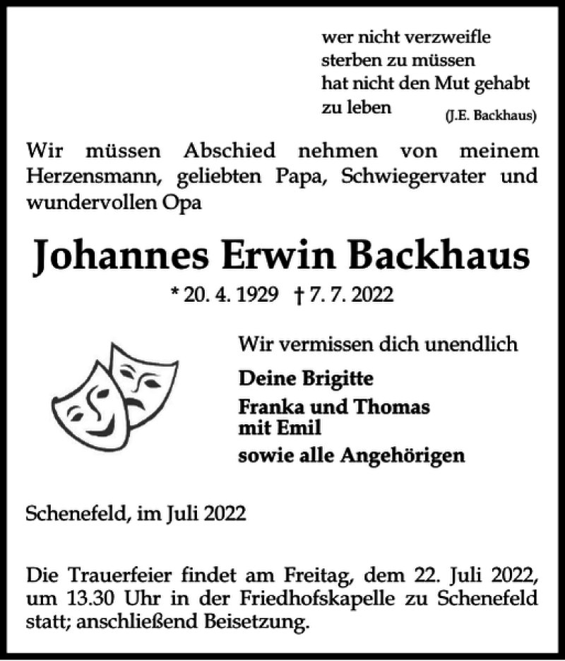 Hier finden Sie alle Traueranzeigen aus der Zeitung, die bisher für Johannes Erwin Backhaus erschienen sind. Weitere Traueranzeigen, die in der Zeitung erscheinen, werden hier ebenfalls aufgelistet
