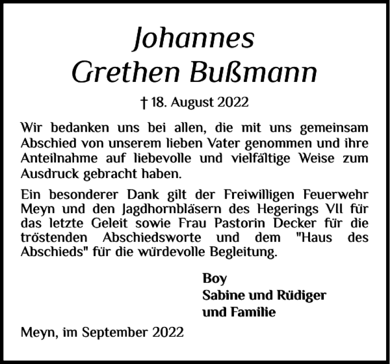 Hier finden Sie alle Traueranzeigen aus der Zeitung, die bisher für Johannes Grethen Bußmann erschienen sind. Weitere Traueranzeigen, die in der Zeitung erscheinen, werden hier ebenfalls aufgelistet