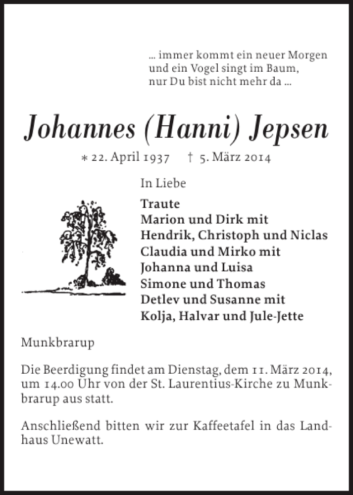Hier finden Sie alle Traueranzeigen aus der Zeitung, die bisher für Johannes Hanni Jepsen erschienen sind. Weitere Traueranzeigen, die in der Zeitung erscheinen, werden hier ebenfalls aufgelistet