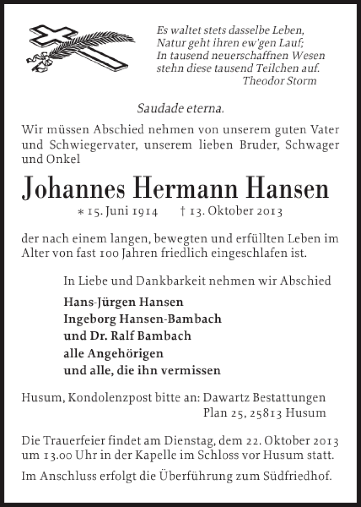 Hier finden Sie alle Traueranzeigen aus der Zeitung, die bisher für Johannes Hermann Hansen erschienen sind. Weitere Traueranzeigen, die in der Zeitung erscheinen, werden hier ebenfalls aufgelistet
