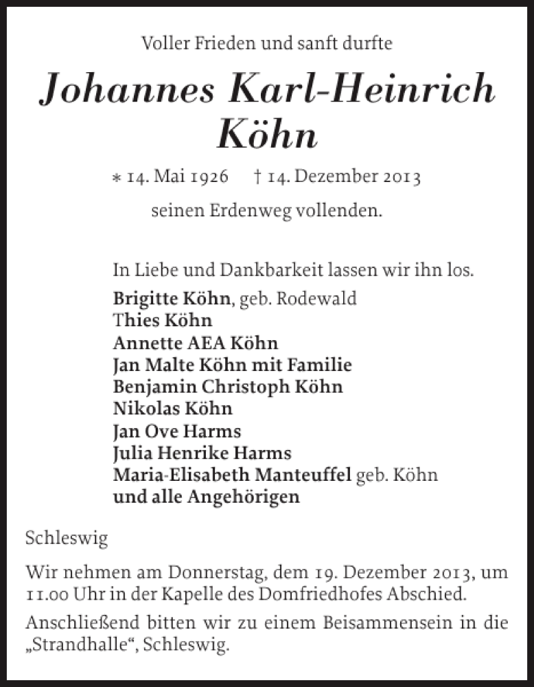Hier finden Sie alle Traueranzeigen aus der Zeitung, die bisher für Johannes Karl-Heinrich Köhn erschienen sind. Weitere Traueranzeigen, die in der Zeitung erscheinen, werden hier ebenfalls aufgelistet