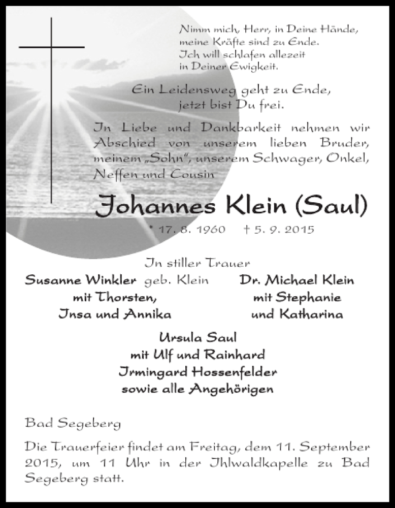 Hier finden Sie alle Traueranzeigen aus der Zeitung, die bisher für Johannes Klein Saul erschienen sind. Weitere Traueranzeigen, die in der Zeitung erscheinen, werden hier ebenfalls aufgelistet