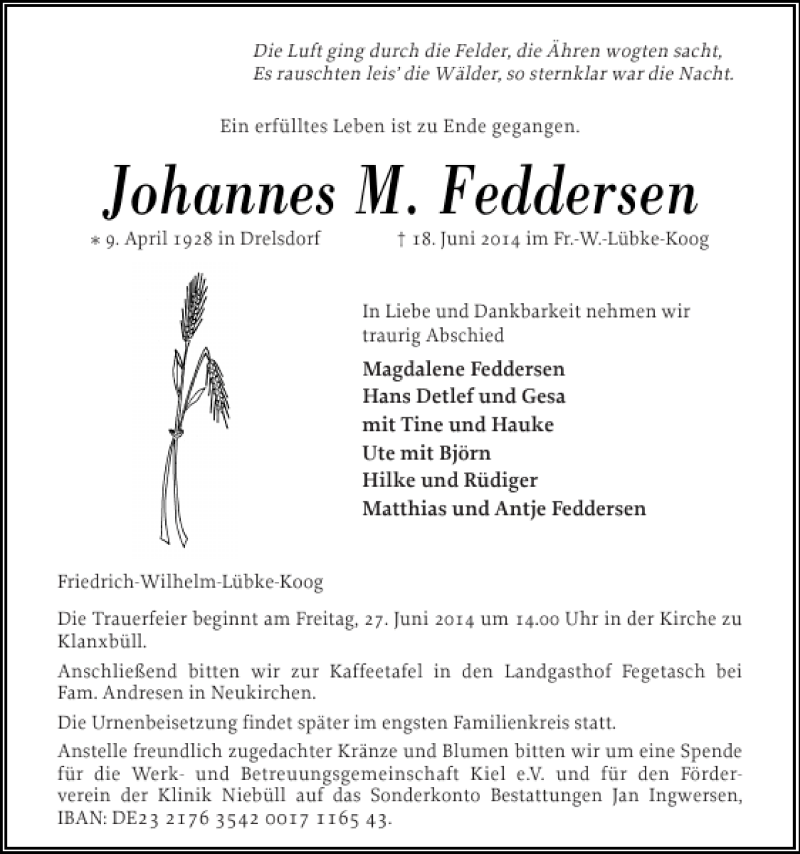 Hier finden Sie alle Traueranzeigen aus der Zeitung, die bisher für Johannes M. Feddersen erschienen sind. Weitere Traueranzeigen, die in der Zeitung erscheinen, werden hier ebenfalls aufgelistet