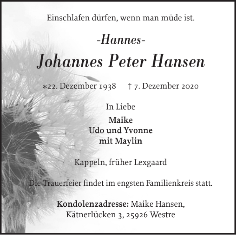 Hier finden Sie alle Traueranzeigen aus der Zeitung, die bisher für Johannes Peter Hansen erschienen sind. Weitere Traueranzeigen, die in der Zeitung erscheinen, werden hier ebenfalls aufgelistet