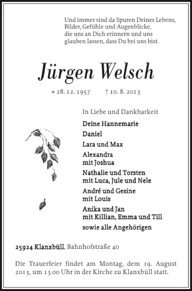 Hier finden Sie alle Traueranzeigen aus der Zeitung, die bisher für Jürgen Welsch erschienen sind. Weitere Traueranzeigen, die in der Zeitung erscheinen, werden hier ebenfalls aufgelistet