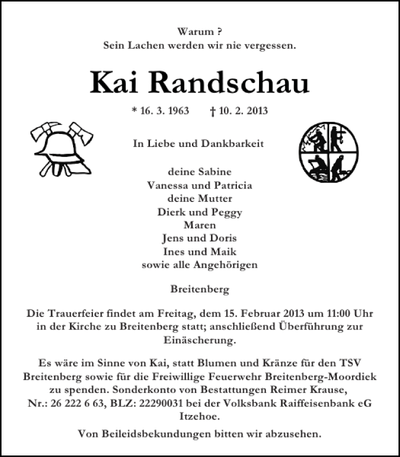 Hier finden Sie alle Traueranzeigen aus der Zeitung, die bisher für Kai Randschau erschienen sind. Weitere Traueranzeigen, die in der Zeitung erscheinen, werden hier ebenfalls aufgelistet
