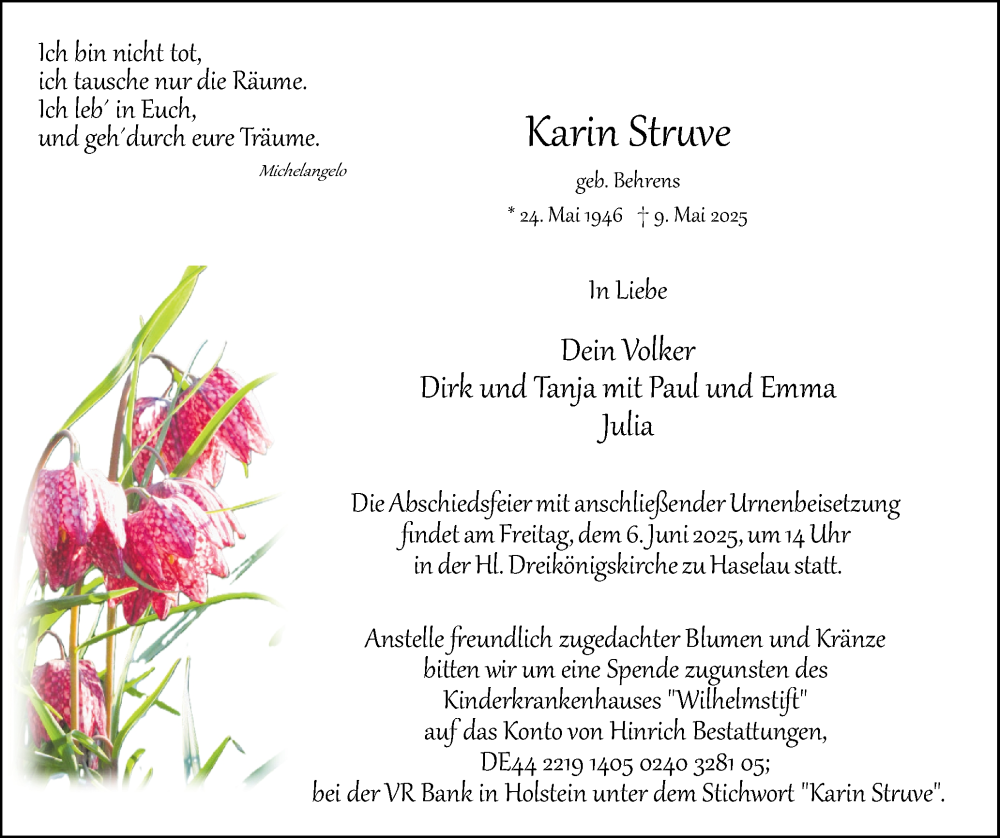 Hier finden Sie alle Traueranzeigen aus der Zeitung, die bisher für Karin Struve erschienen sind. Weitere Traueranzeigen, die in der Zeitung erscheinen, werden hier ebenfalls aufgelistet