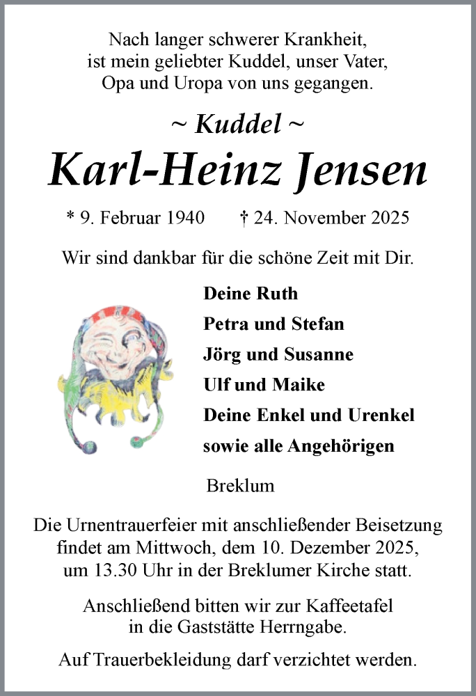 Hier finden Sie alle Traueranzeigen aus der Zeitung, die bisher für Karl-Heinz Jensen erschienen sind. Weitere Traueranzeigen, die in der Zeitung erscheinen, werden hier ebenfalls aufgelistet