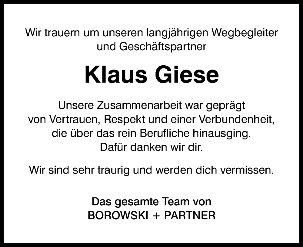 Hier finden Sie alle Traueranzeigen aus der Zeitung, die bisher für Klaus Giese erschienen sind. Weitere Traueranzeigen, die in der Zeitung erscheinen, werden hier ebenfalls aufgelistet