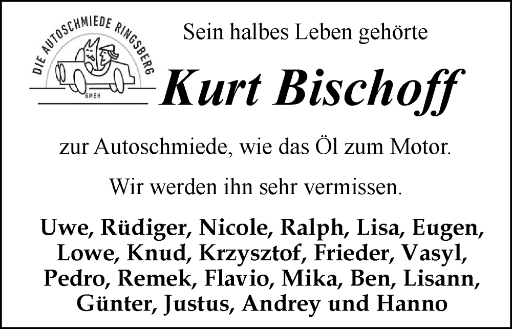 Hier finden Sie alle Traueranzeigen aus der Zeitung, die bisher für Kurt Bischoff erschienen sind. Weitere Traueranzeigen, die in der Zeitung erscheinen, werden hier ebenfalls aufgelistet