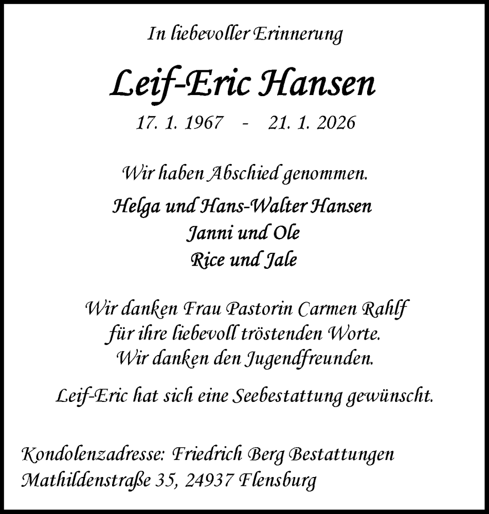 Hier finden Sie alle Traueranzeigen aus der Zeitung, die bisher für Leif-Eric Hansen erschienen sind. Weitere Traueranzeigen, die in der Zeitung erscheinen, werden hier ebenfalls aufgelistet