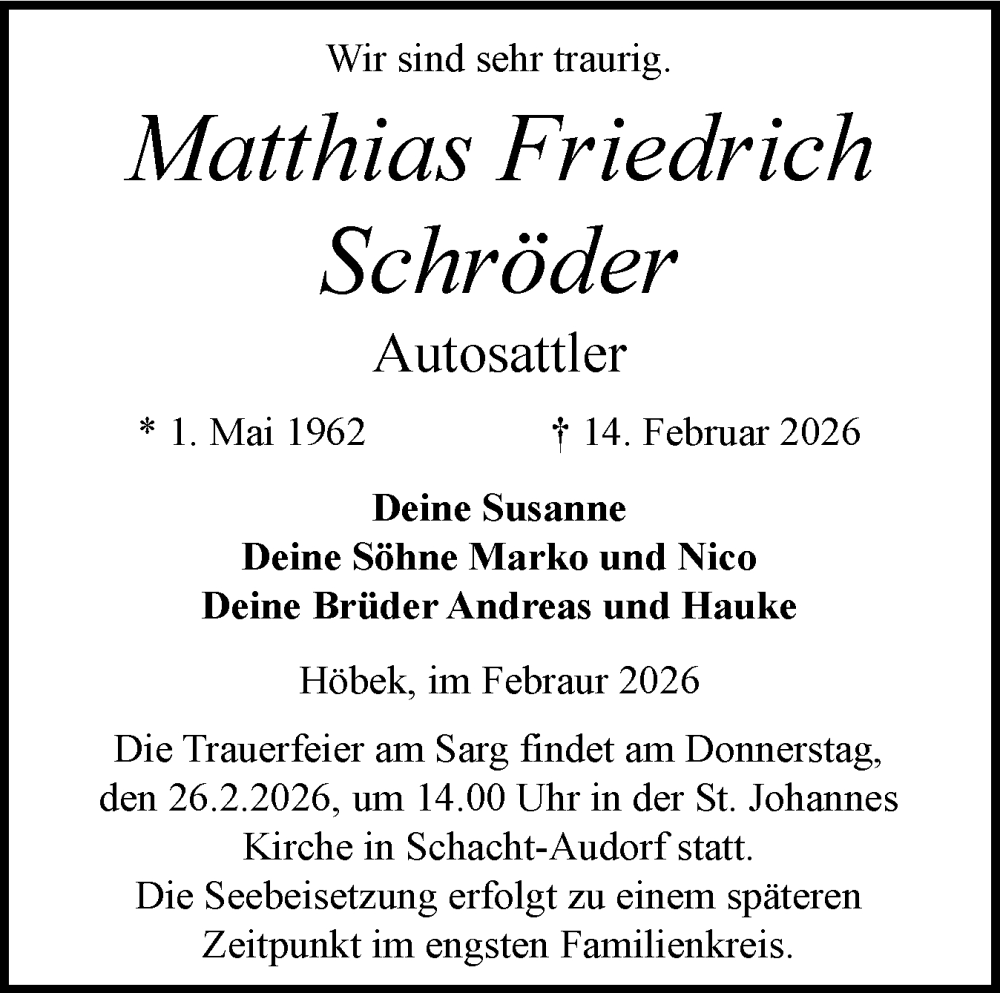 Hier finden Sie alle Traueranzeigen aus der Zeitung, die bisher für Matthias Friedrich Schröder erschienen sind. Weitere Traueranzeigen, die in der Zeitung erscheinen, werden hier ebenfalls aufgelistet