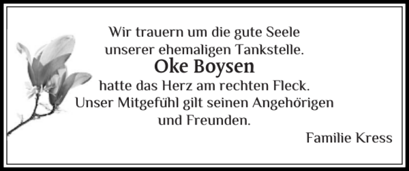 Hier finden Sie alle Traueranzeigen aus der Zeitung, die bisher für Oke Boysen erschienen sind. Weitere Traueranzeigen, die in der Zeitung erscheinen, werden hier ebenfalls aufgelistet