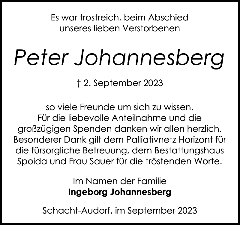 Hier finden Sie alle Traueranzeigen aus der Zeitung, die bisher für Peter Johannesberg erschienen sind. Weitere Traueranzeigen, die in der Zeitung erscheinen, werden hier ebenfalls aufgelistet
