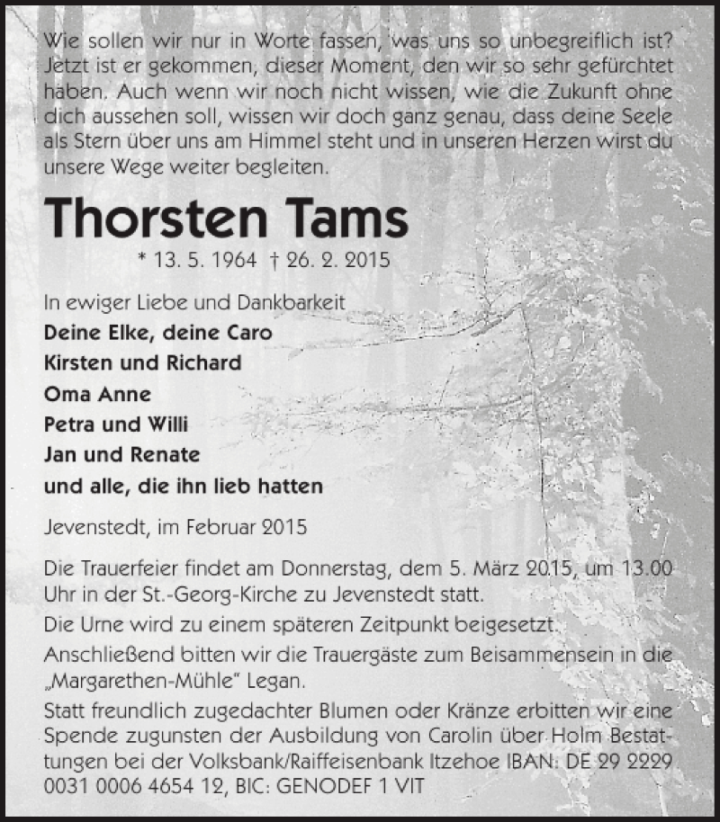 Hier finden Sie alle Traueranzeigen aus der Zeitung, die bisher für Thorsten Tams erschienen sind. Weitere Traueranzeigen, die in der Zeitung erscheinen, werden hier ebenfalls aufgelistet