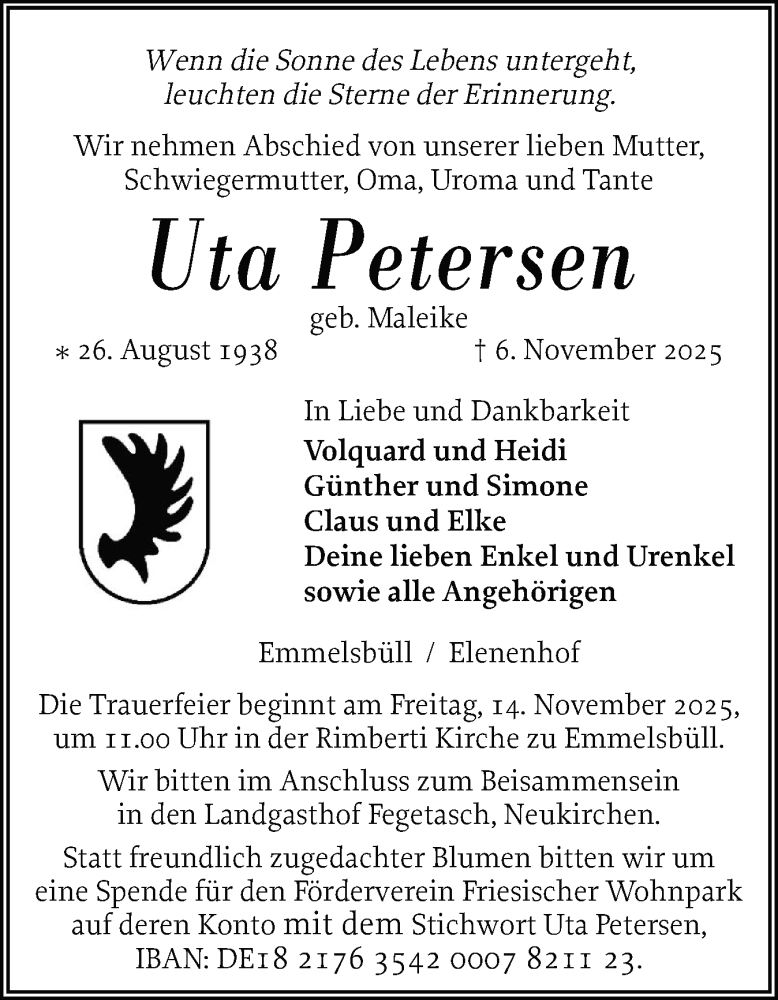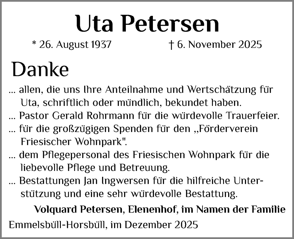 Hier finden Sie alle Traueranzeigen aus der Zeitung, die bisher für Uta Petersen erschienen sind. Weitere Traueranzeigen, die in der Zeitung erscheinen, werden hier ebenfalls aufgelistet