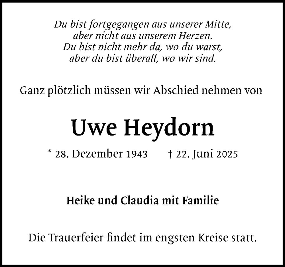Hier finden Sie alle Traueranzeigen aus der Zeitung, die bisher für Uwe Heydorn erschienen sind. Weitere Traueranzeigen, die in der Zeitung erscheinen, werden hier ebenfalls aufgelistet