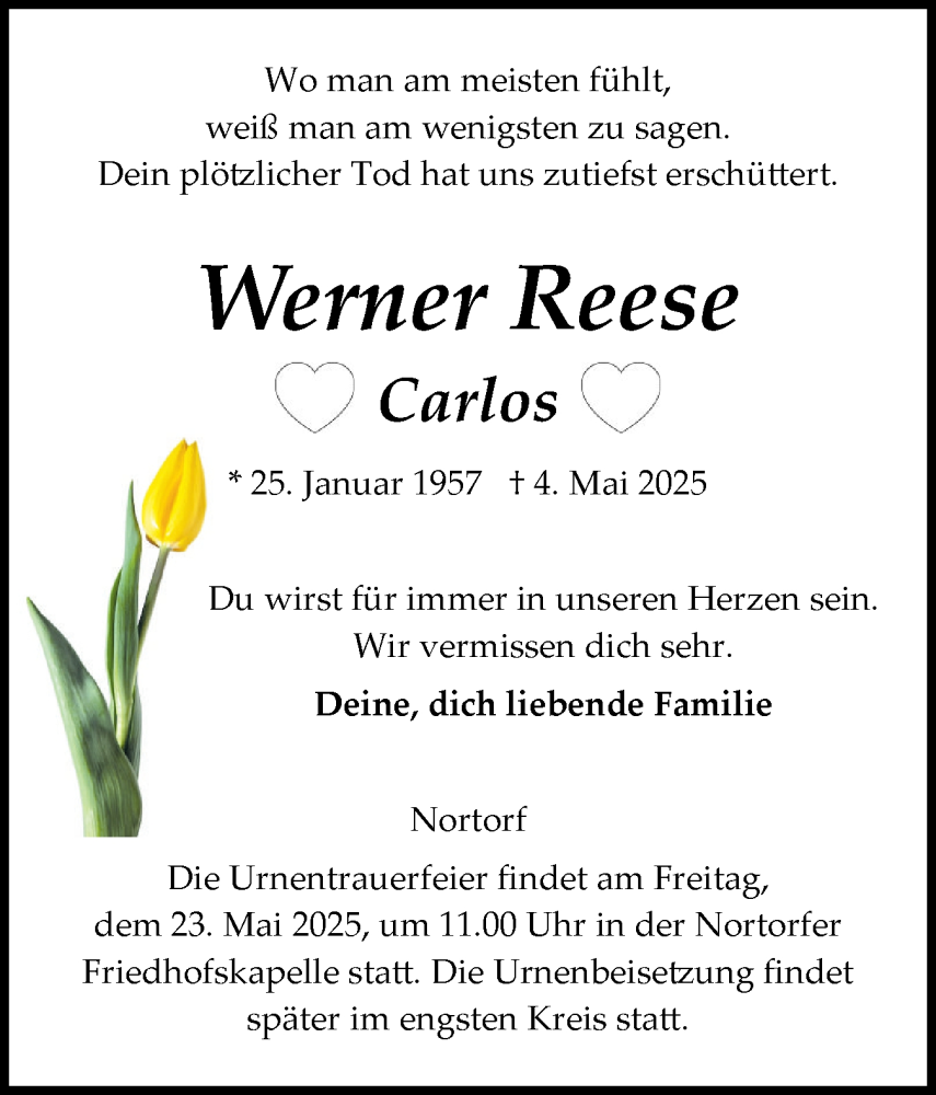 Hier finden Sie alle Traueranzeigen aus der Zeitung, die bisher für Werner Reese erschienen sind. Weitere Traueranzeigen, die in der Zeitung erscheinen, werden hier ebenfalls aufgelistet