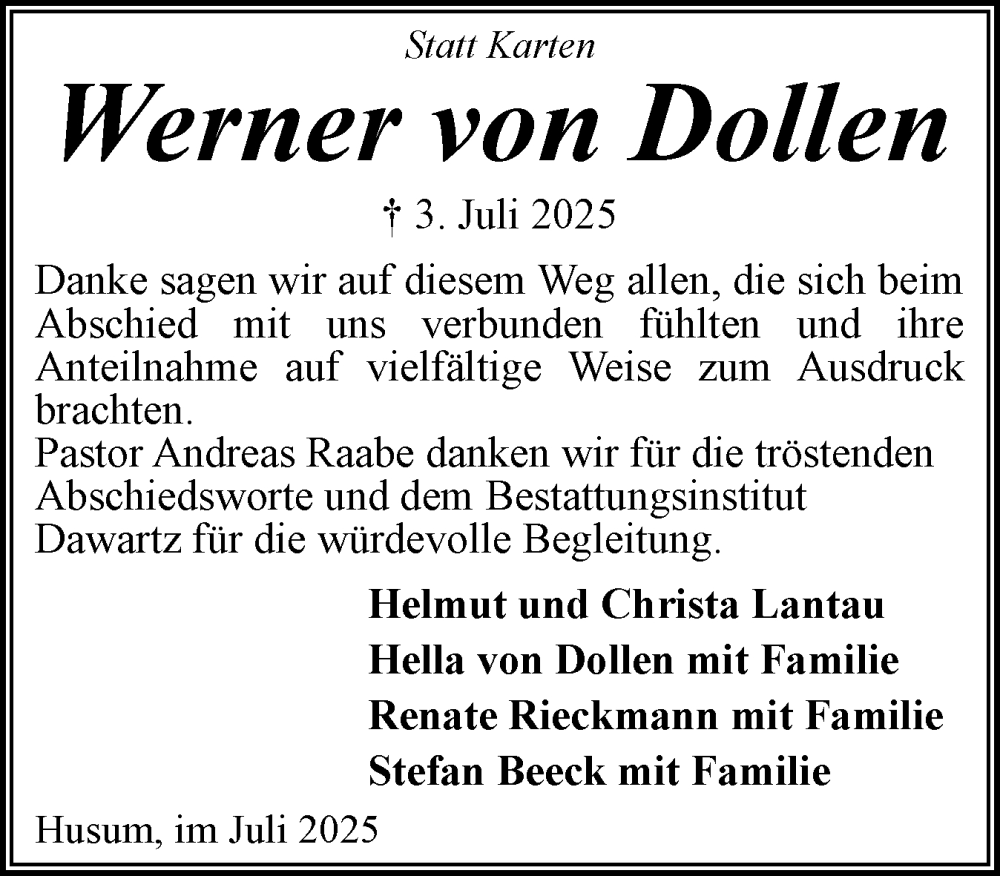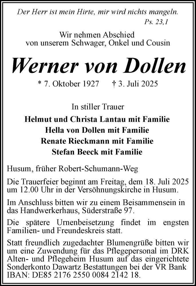 Hier finden Sie alle Traueranzeigen aus der Zeitung, die bisher für Werner von Dollen erschienen sind. Weitere Traueranzeigen, die in der Zeitung erscheinen, werden hier ebenfalls aufgelistet
