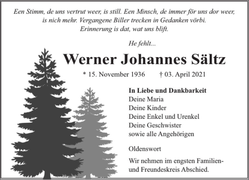 Hier finden Sie alle Traueranzeigen aus der Zeitung, die bisher für Werner Johannes Sältz erschienen sind. Weitere Traueranzeigen, die in der Zeitung erscheinen, werden hier ebenfalls aufgelistet