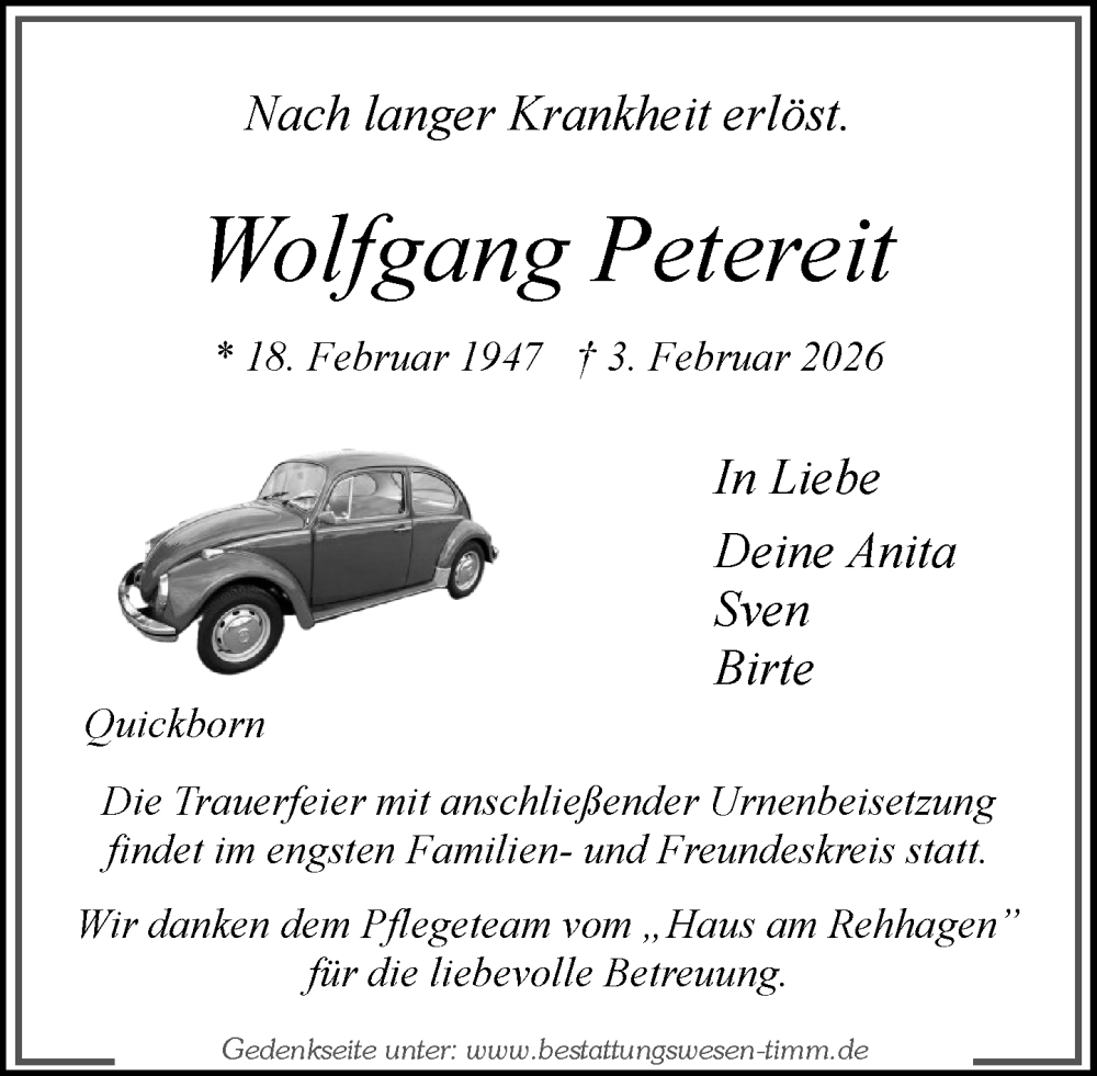 Hier finden Sie alle Traueranzeigen aus der Zeitung, die bisher für Wolfgang Petereit erschienen sind. Weitere Traueranzeigen, die in der Zeitung erscheinen, werden hier ebenfalls aufgelistet