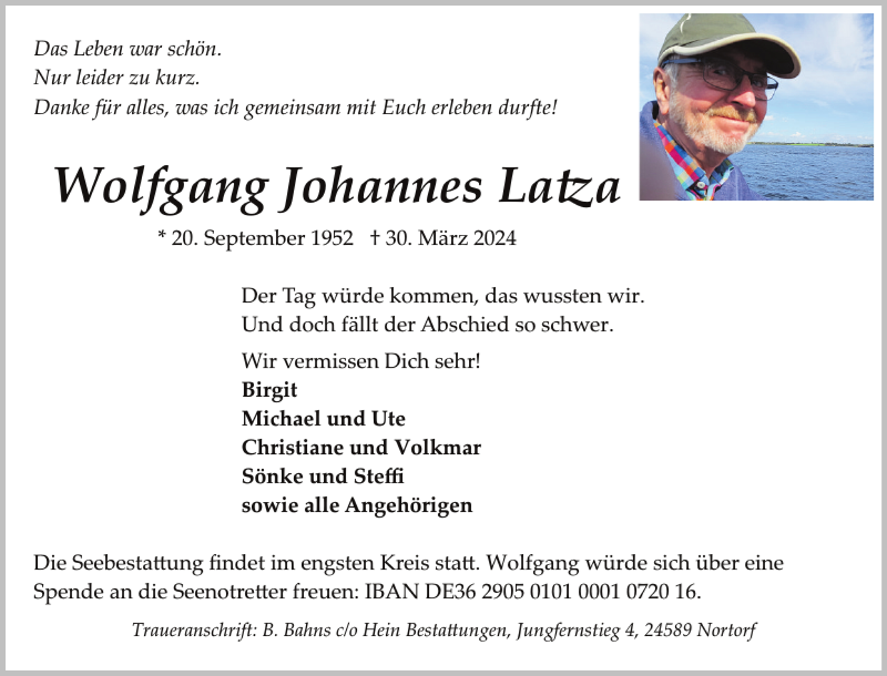 Hier finden Sie alle Traueranzeigen aus der Zeitung, die bisher für Wolfgang Johannes Latza erschienen sind. Weitere Traueranzeigen, die in der Zeitung erscheinen, werden hier ebenfalls aufgelistet