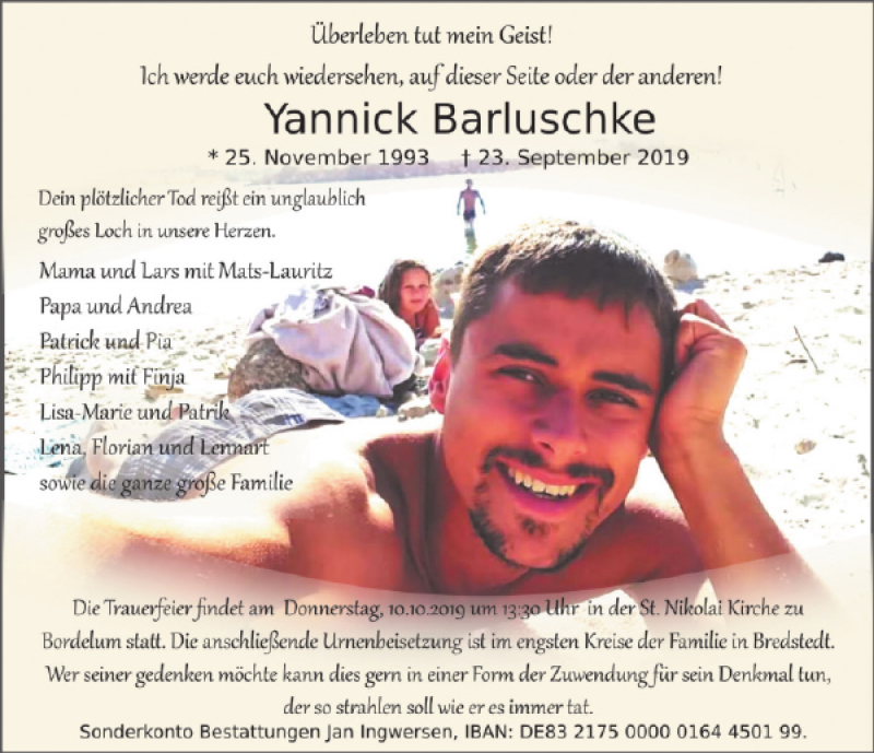 Hier finden Sie alle Traueranzeigen aus der Zeitung, die bisher für Yannick Barluschke erschienen sind. Weitere Traueranzeigen, die in der Zeitung erscheinen, werden hier ebenfalls aufgelistet